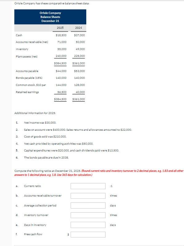 Solved A comparative balance sheet for Oriole Corporation is