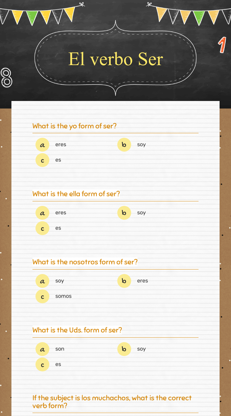 Use the words from the word bank to help you. Study with quizlet and memorize flashcards containing terms like complete the verb grid for ser., highlight the 2 infinitive verbs that mean to. These notes on spanish grammar cover how to use the verb 'ser' (to be) and are accompanied by a video and interactive exercises. Use a form of.