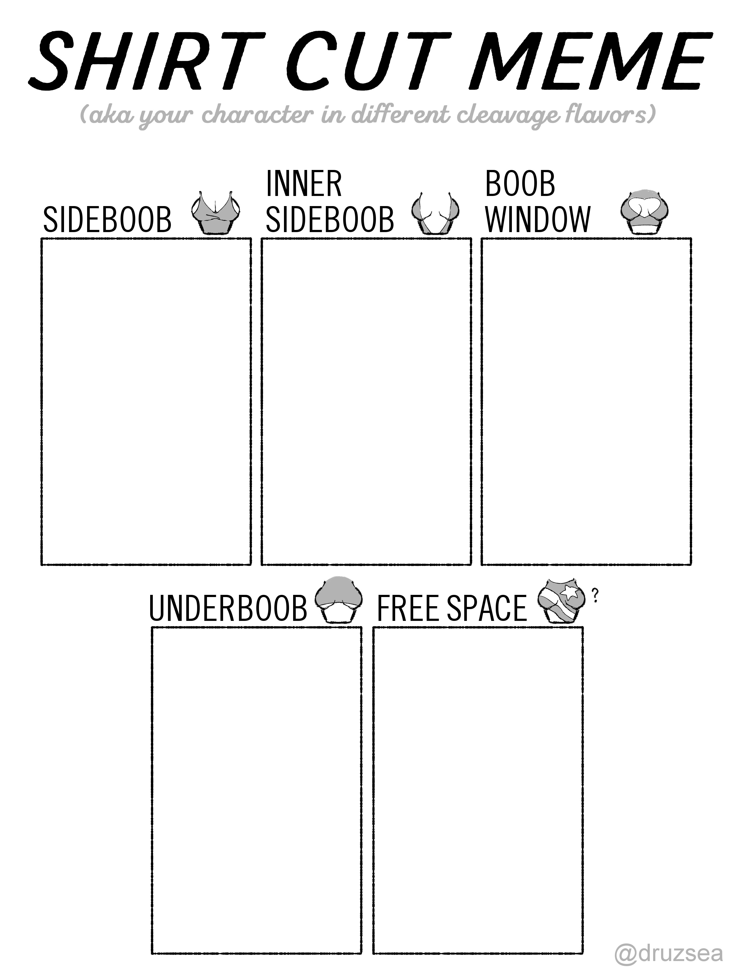 The template was originally posted in june of 2021, by user @druzsea (blank template here). The meme is a template for artists to draw characters from 5 different angles that partially reveal their breasts. Lightning fast, free, online meme generator and meme maker. The post gained over 3,600 retweets and 14,500 likes in one. Get inspired and try out new things. Head over to our templates gallery! Discover pinterest’s best ideas and inspiration for shirt cut meme. Lift your spirits with funny jokes, trending memes, entertaining gifs, inspiring stories, viral videos, and so much more from users like redsalsa. The template, captioned shirt cut meme, offers panels for sideboob, inner sideboob, boob window, underboob and a free space left to the. Use shirt cut meme template to make shirt cut memes in seconds.
